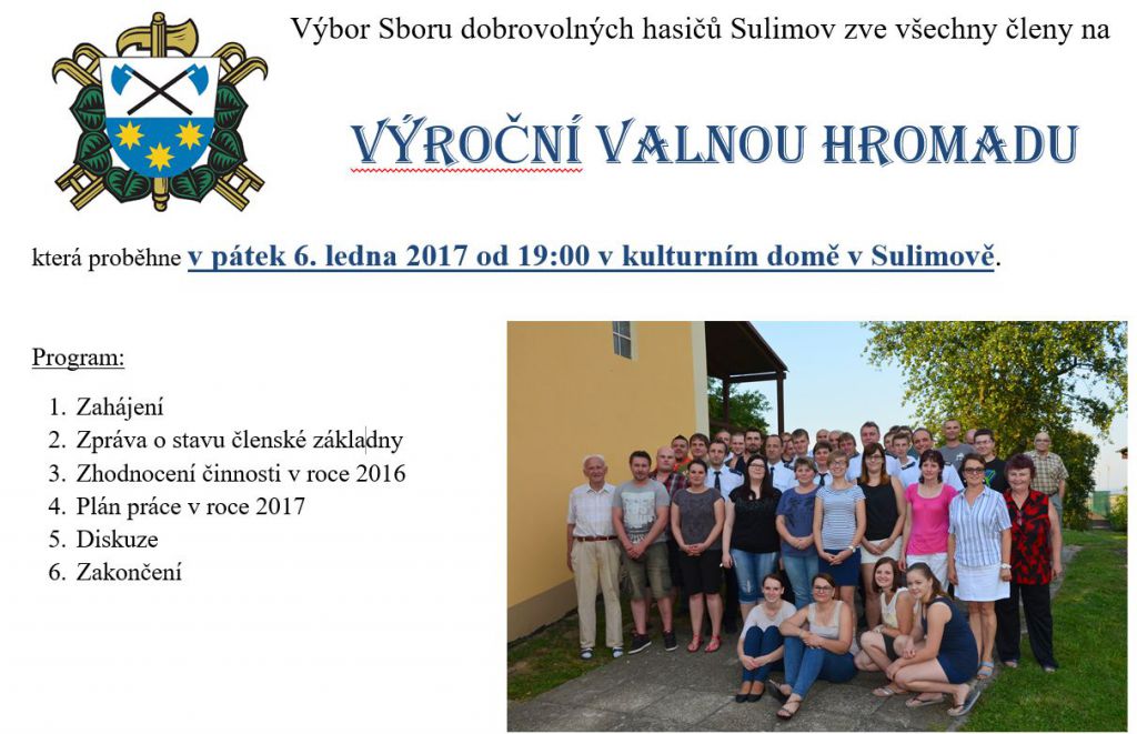 Pozvánka na výroční valnou hromadu sboru Výbor SDH Sulimov zve všechny členy sboru na výroční valnou hromadu, která se uskuteční v pátek 6. 1. 2017 v 19:00 hod. na kulturním domě.