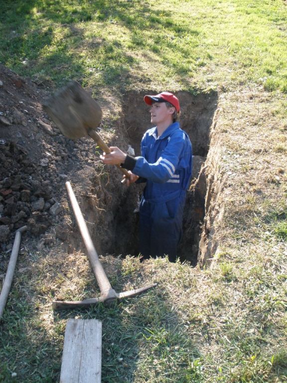 Práce při úpravě koryta potoka na dolním konci obce