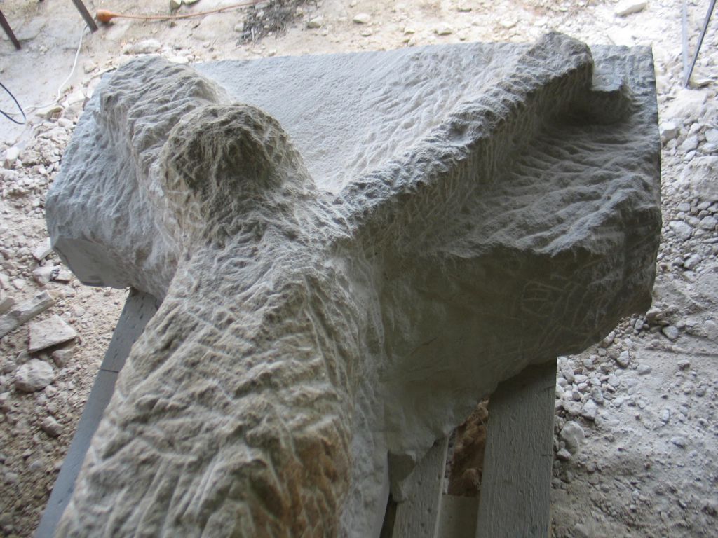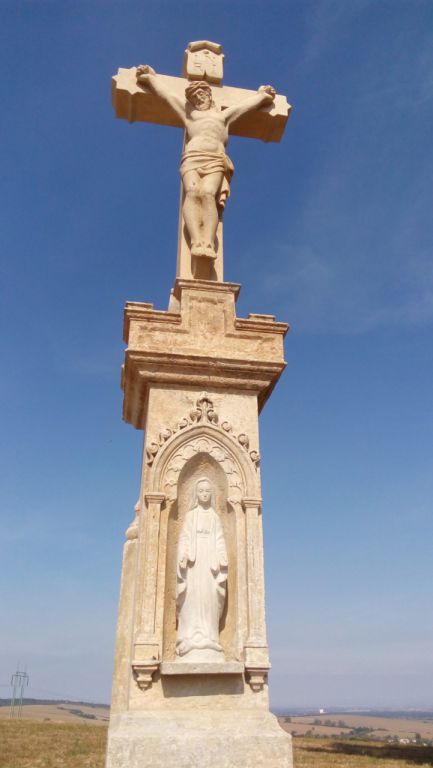 Kříž je složen ze dvou dílů - jeden je zhotoven z jednoho kusu kamene ve tvaru "T", kde svislá část je dlouhá 150 cm, vodorovná 100 cm. K této části se přidala druhá o délce 50 cm. Slovo tvůrce: „Replika kříže byla vyrobena technologií nazvanou tečkování, kdy na originálu i kopii se vytvoří tři pevné body a tečkovacím zařízením se odměřují hloubky a proporce jednotlivých částí. Tato technika se používá pro vytvoření replik v poměru 1:1,“ vysvětlil Jan Ševčík.